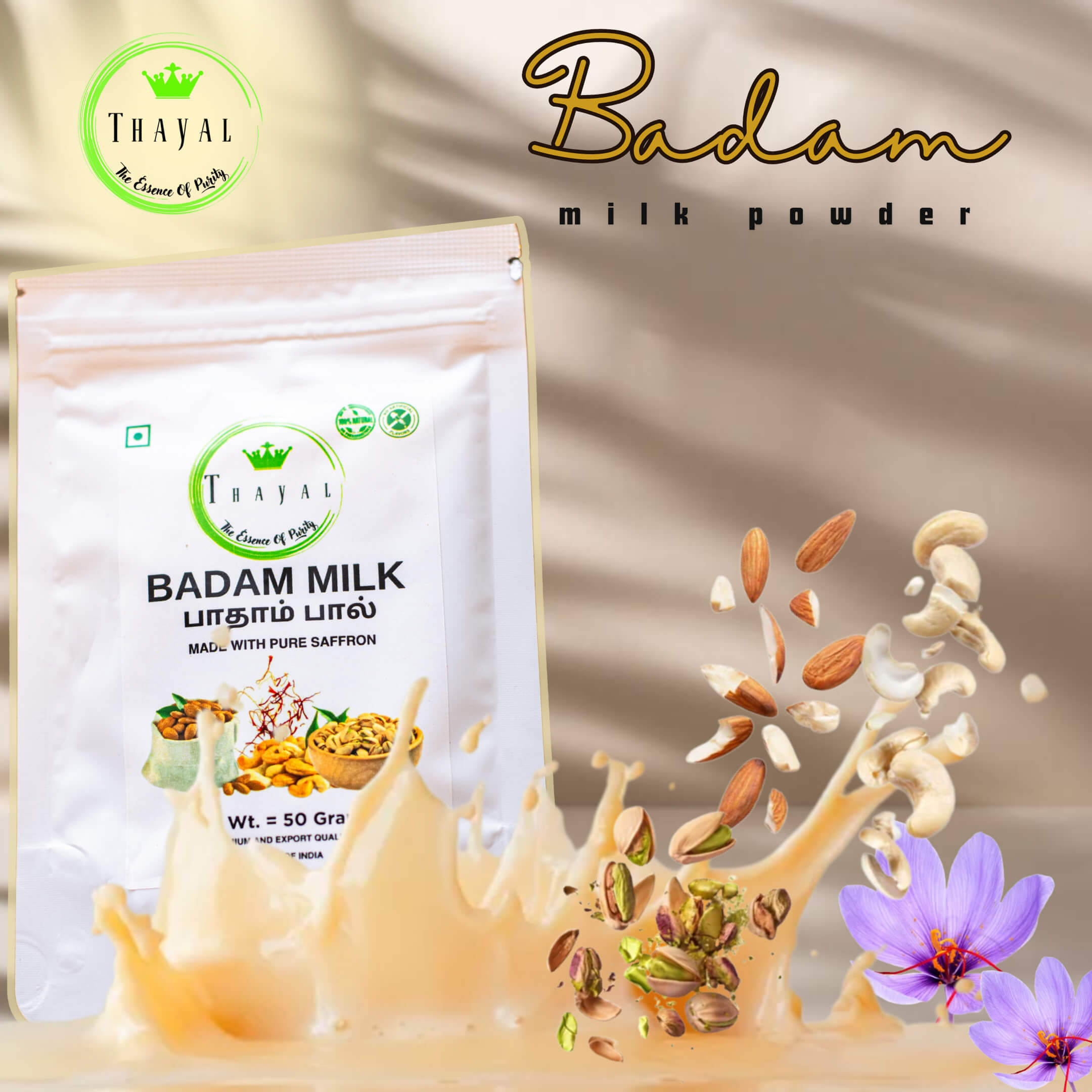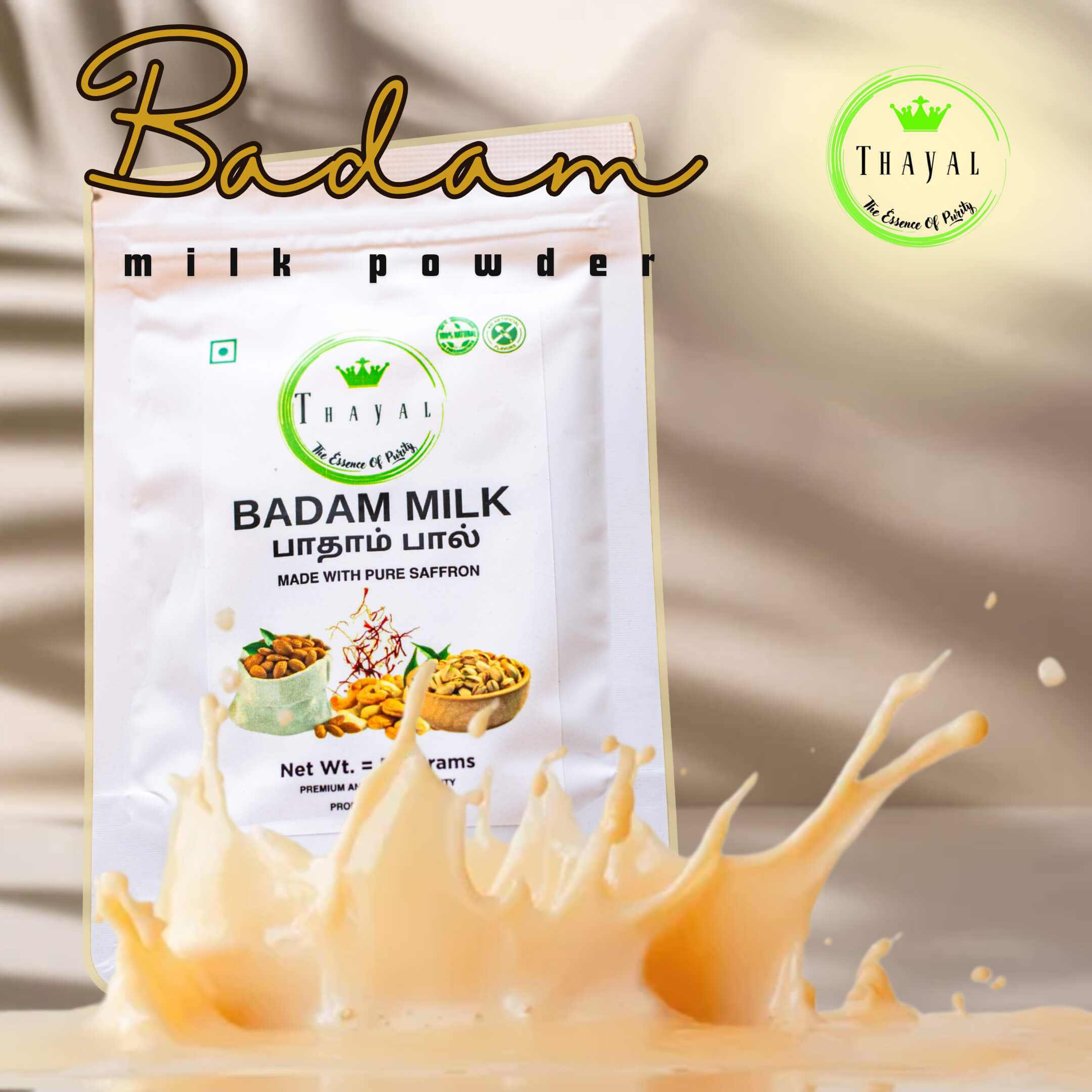 Thayal Badam Milk Powder is a rich blend made from premium almonds. It dissolves easily in warm milk, creating a creamy and flavorful drink with a traditional taste.